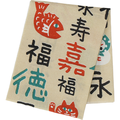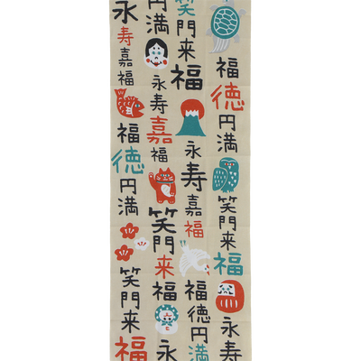 It is illustrated with the auspicious four-kanji idioms, each meaning “wealth and happiness,” “laughter brings good fortune,” and “longevity and goodfortune.”